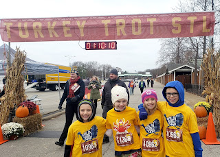 We started out Thanksgiving morning doing the St. Louis Turkey Trot. Evie was the only one in Ben's family that wanted to run with us. It was a pretty cold morning after we'd had a weekend of good weather, but it was fun to get out & start the day off right!